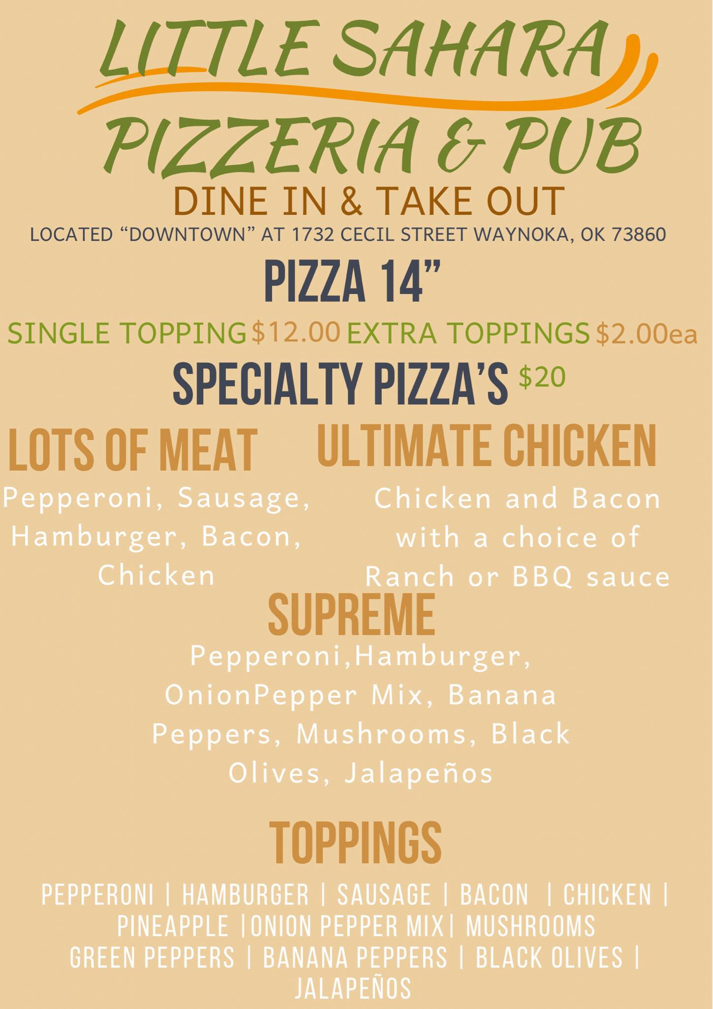 Little Sahara Pizzeria & Pub is a restaurant in Waynoka, OK where you can relax, eat great food, and make memories.Stop by for a quick lunch or bring the family in for an early supper. Our menu is sure to have something for all tastebuds.